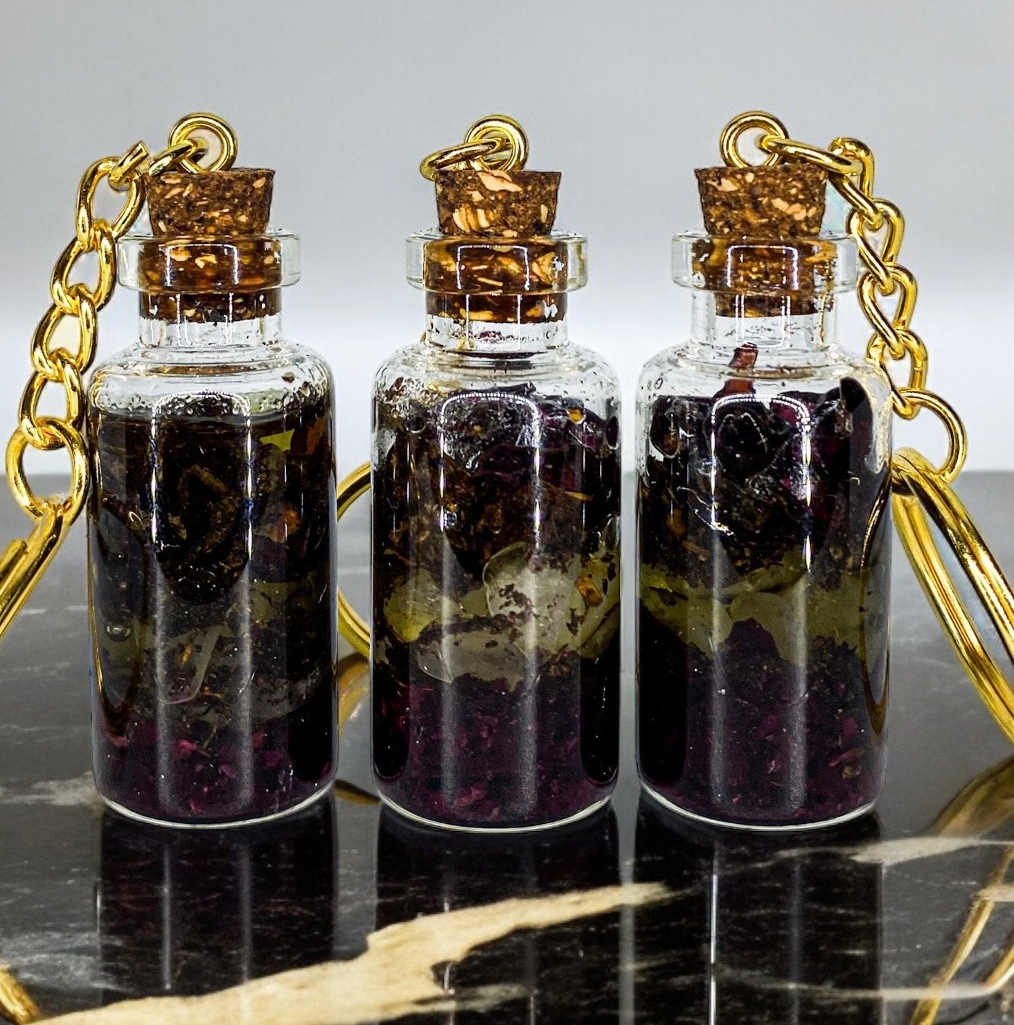 Celebrate passion and romance with the Love & Lust Keychain, a handmade charm filled with patchouli herb, garnet, rose petals, rose quartz, and rose essential oil. This compact talisman blends floral and earthy elements for a sensual and heartfelt touch.